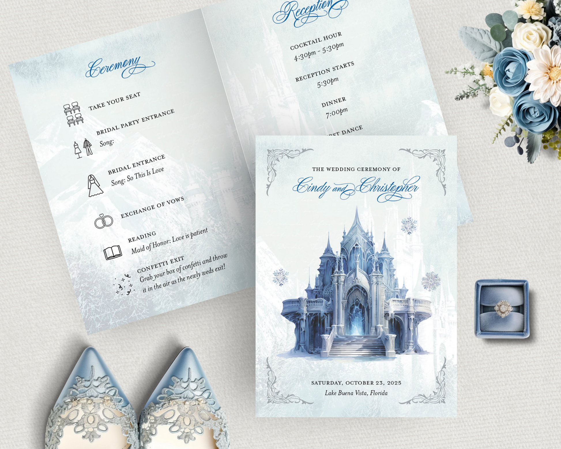 A fairytale Castle is a simply elegant design for your wedding programs. Plenty of room for your bridal party and ceremony info.
